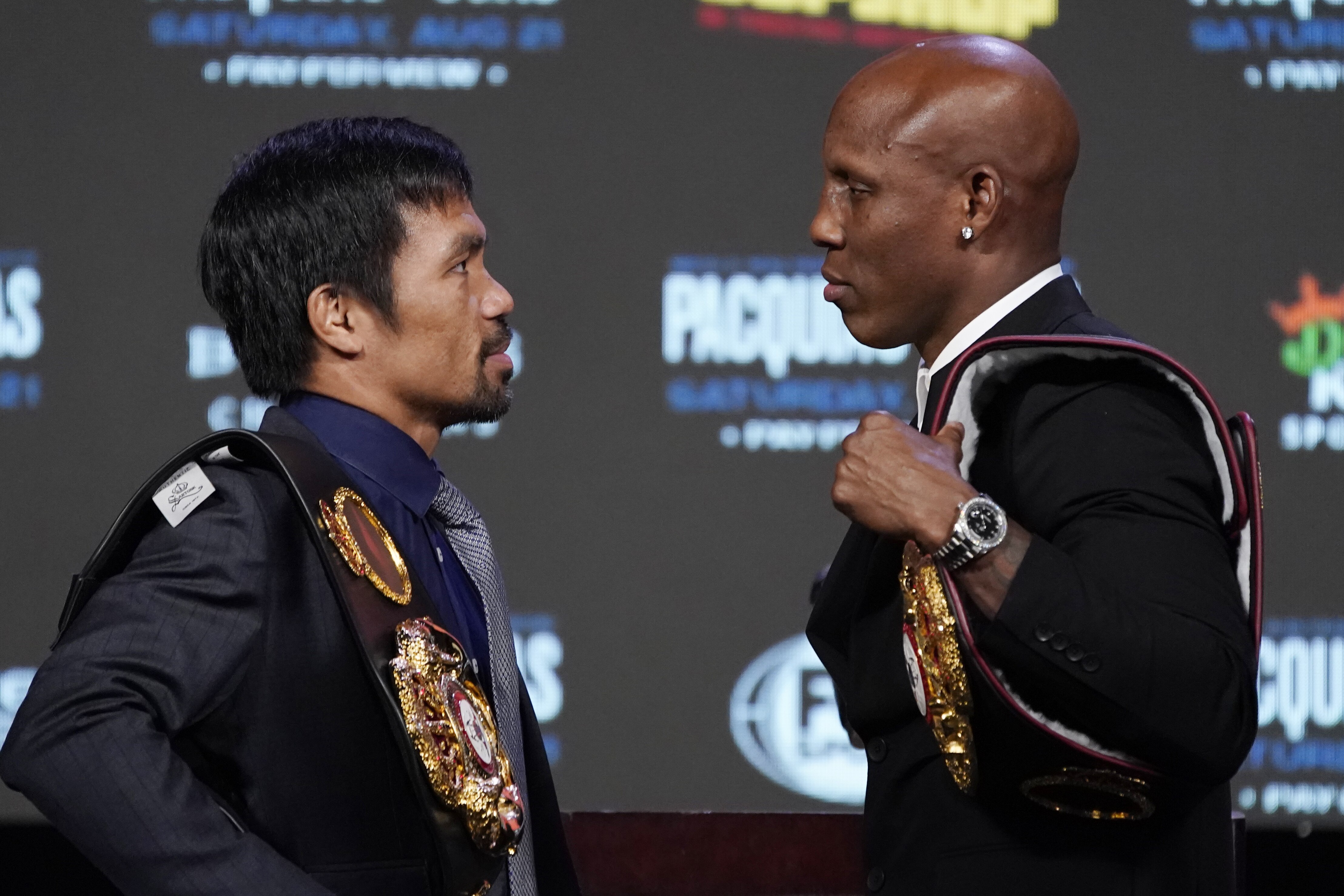 Manny Pacquiao vs Yordenis Ugas. Pacquiao vs Ugas purse payouts. Manny Pacquiao left and Yordenis Ugas at news conference on Aug.